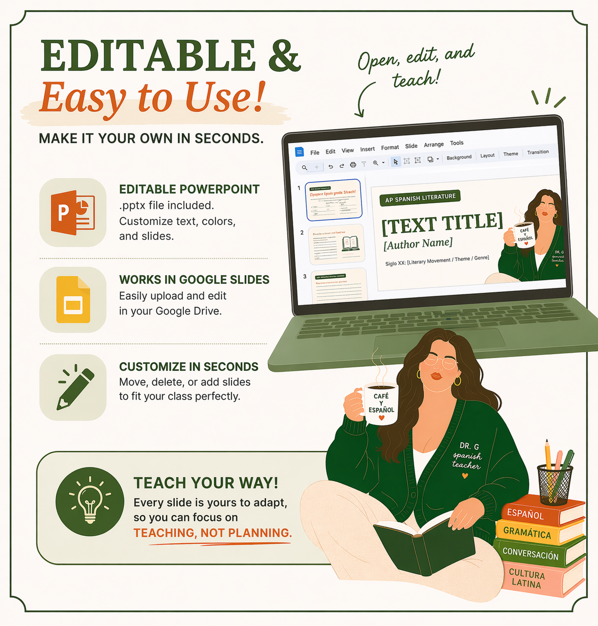 Get anytime access to our AP Spanish Literature Tomorrow's Lesson Slide Maker Tool. New features and upgrades added every month.